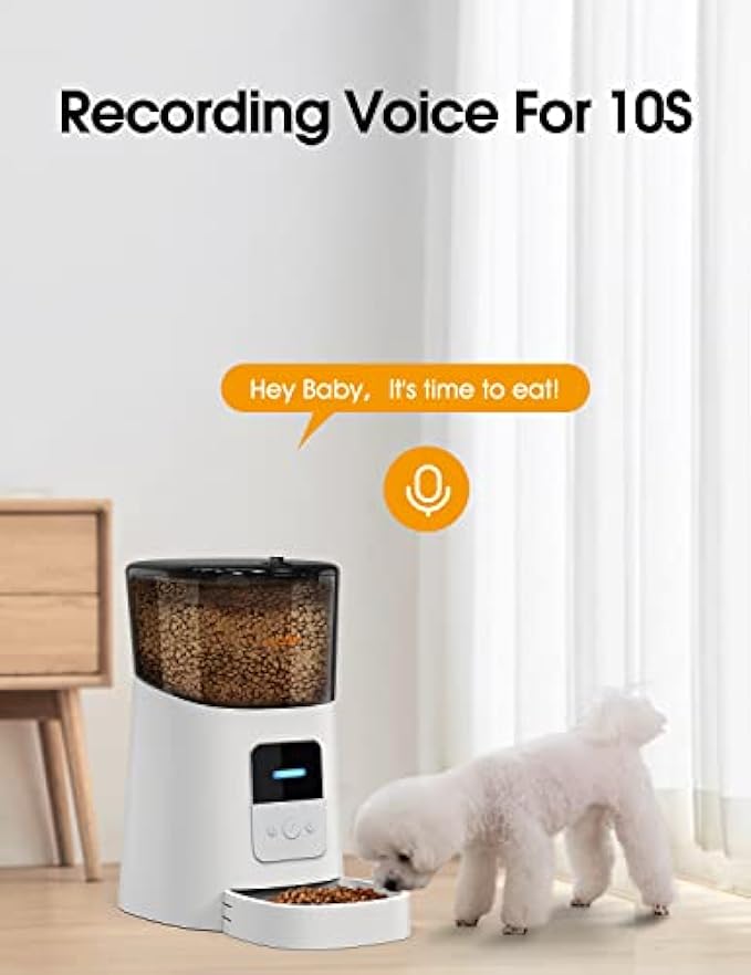 RECORD CUSTOM MESSAGES FOR YOUR PET: Get your pet excited for a meal! Press and hold the record button to start recording a voice message with each meal. Every time you leave the house, if you want to comfort your pet, a pre-recorded voice message plays when they're about to eat, linking comfort and safety with your voice (like Come on, Fido! Come eat, boy! Good dog.)