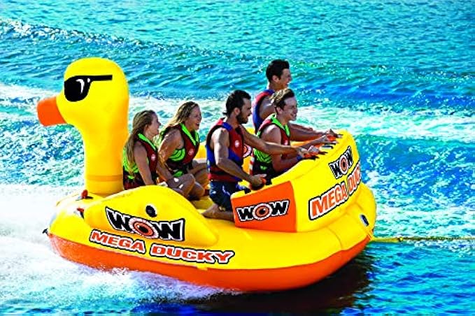 Free 11-inch 5k aluminum EX tow connector included in the large inflatable duck. EVA foam seat and knee pad for comfort. Makes for a great floating island for relaxing after your ride.
