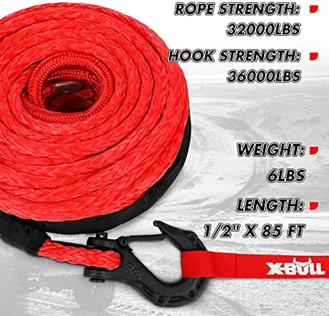 Product Includes: Forged Winch Hook(36000 lbs) + 1/2 inch x 85 ft (32000 lbs) Bold winch rope + 5ft Sliding Protective Sleeve+X-BULL Car sticker, can effectively prevent the Winch Rope from Wearing, Overheating and Slipping + Come with Hook Safety Pull Strap, pull out the winch rope more safely.