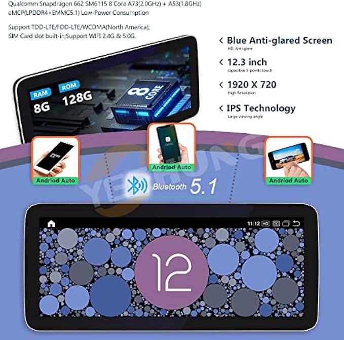 • Blue Anti-Glared 1920X720 HD Screen, 12.3" oversized Display, Multi-Point Capacitive Touch Function.