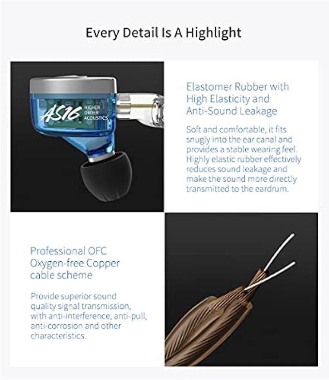 【DRIVERS IMPROVED】Yinyoo KZ AS16 : 8 BA balanced armature per side, 4ba for high frequency, 2ba for mid frequency, 2ba for low frequency, 3 sound tube, which provide excellent sound, rich in details.The sounds signature is balanced,coherent top to bottom with good deep solid bass,clear mid range and beautiful high frequencies.The PCB board is added to give full play of all the drivers, displaying a smooth, sensible, detailed music experience.