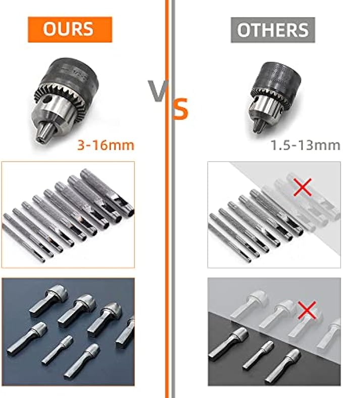• ✅Equip with 3-16mm big Drill Chuck, it Could Clamping thick handles of leather tools